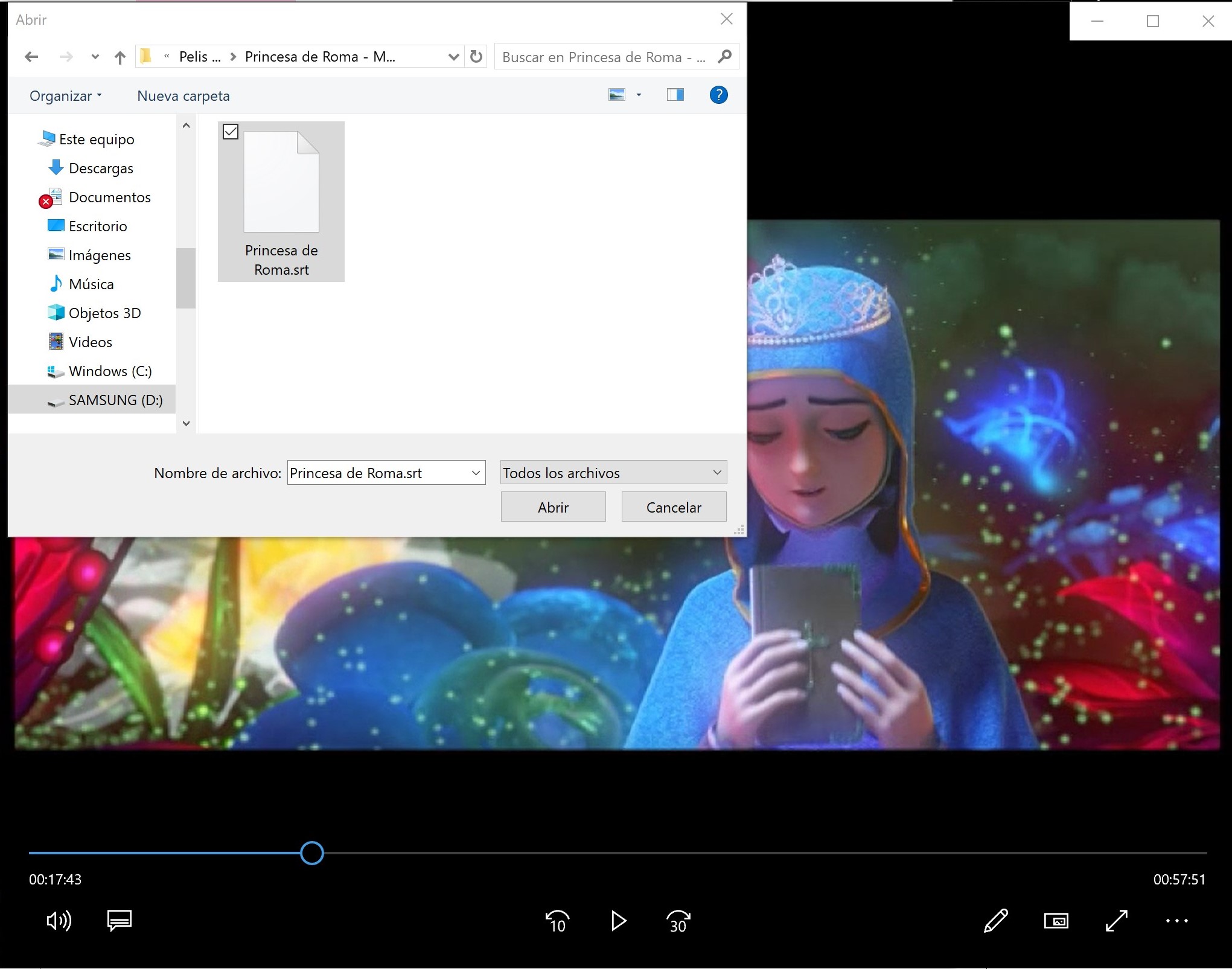 el archivo de subtítulos en una misma carpeta.